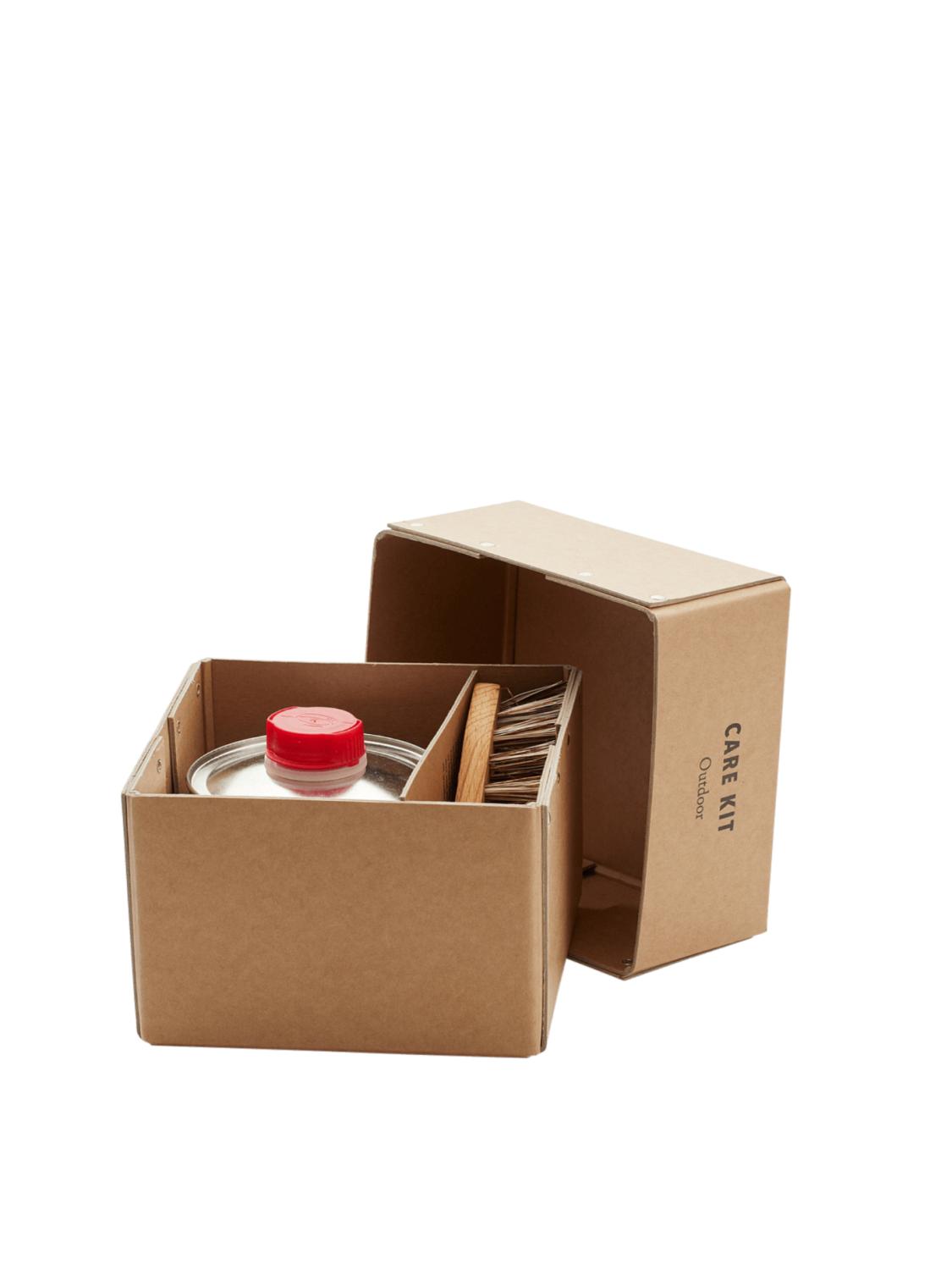 Med Outdoor Care Kit kan du enkelt rengjøre, skrubbe og vedlikeholde hagemøblene dine. Settet leveres i en gjenbrukbar pappeske laget i samarbeid med en lokal sosial virksomhet. Garden Wood Cleaner fjerner alger og skitt, og beskytter mot mugg og sopp. Den medfølgende skrubbebørsten i tre med naturlige bust er produsert i samarbeid med «Blindes Arbejde», et verksted for blinde og svaksynte.