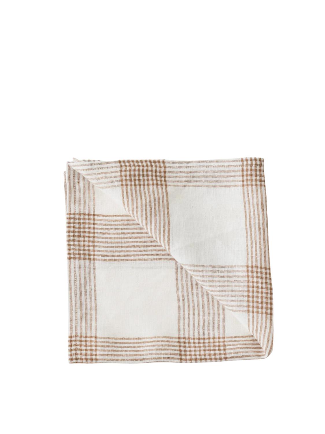 Servietten har en lys, hvit base med tynne brune striper som sammen danner et tidløst og dekorativt rutemønster. Det delikate designet gir en lun og sofistikert følelse som løfter enhver borddekking – enten det er til hverdags eller fest.
