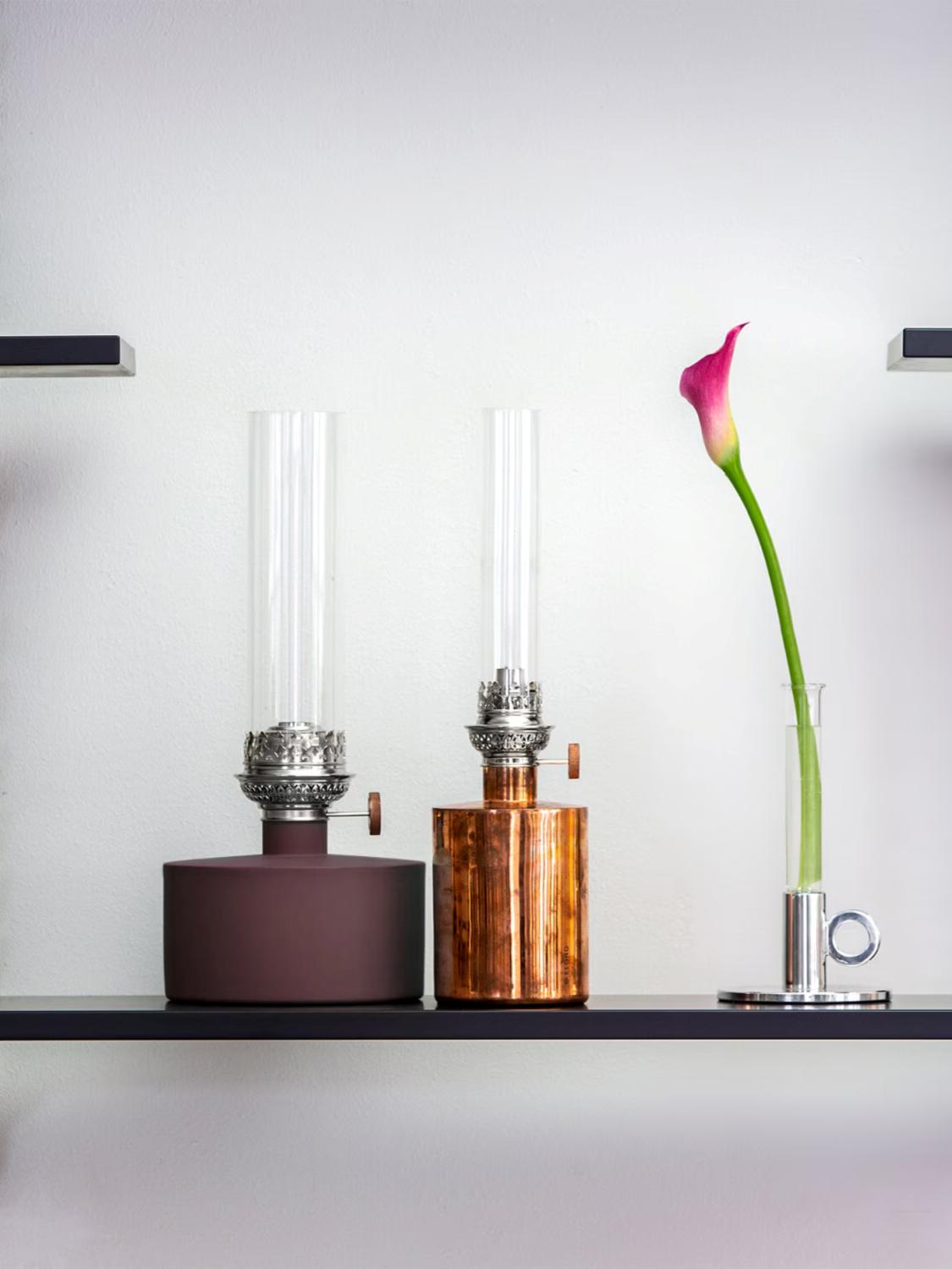 Patina oljelampene vil skape en koselig atmosfære uansett hvor den er plassert. De små oljelampene fås med kobberoverflate og i flere pulverlakkerte farger. De kan tilpasses med klart eller frostet glass.
