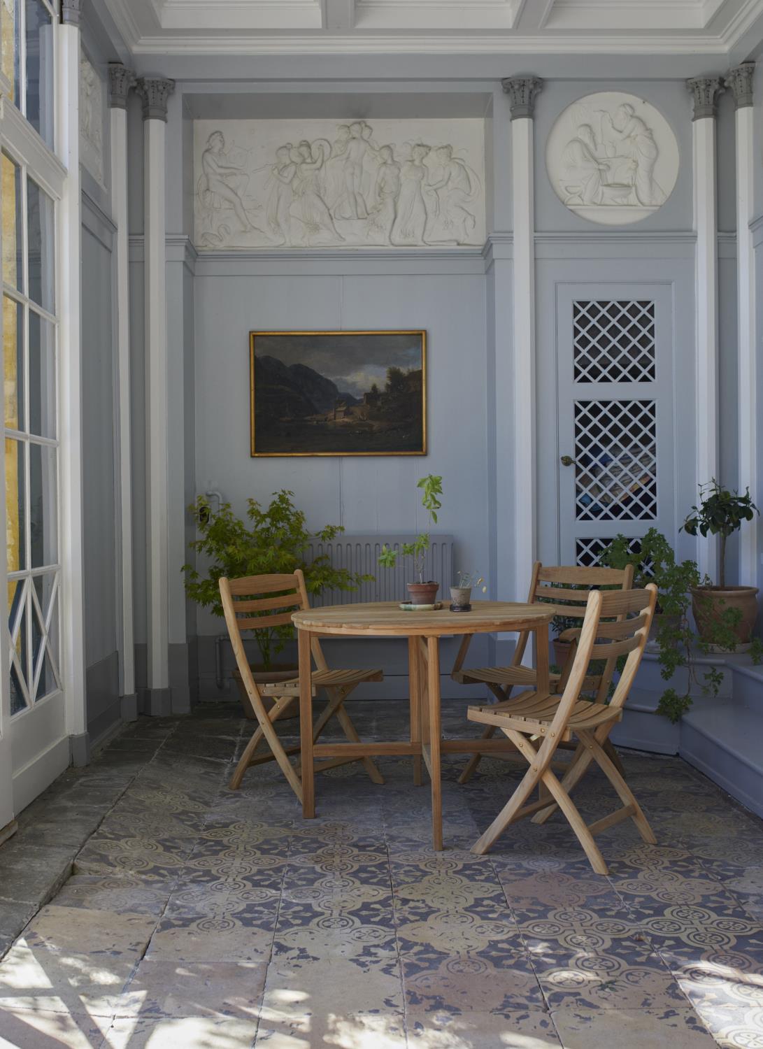 De 100 % FSC-sertifiserte Selandia-stolene i teak er elegante, komfortable og tar minimalt med plass når de er sammenslått. Fint detaljert med alle slissede skruer vendt i samme retning. Rett og slett godt håndverk.