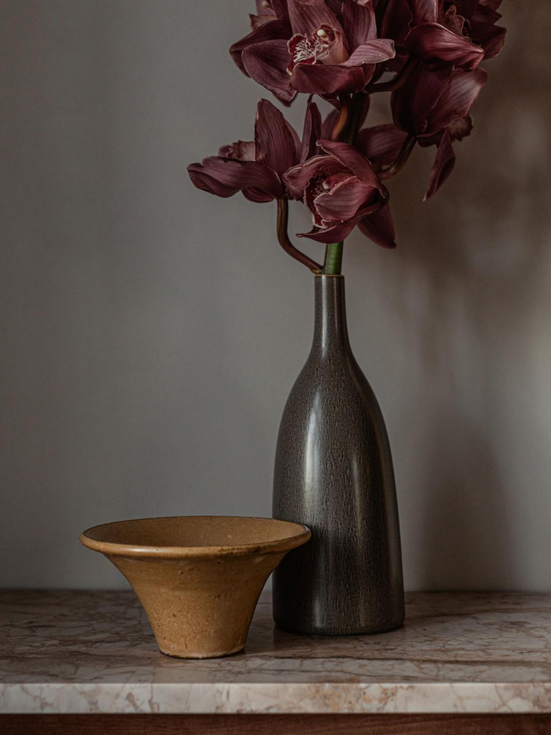 Strandgade-vasen i steintøy har en asymmetrisk form som egner seg til en enkelt avskåret blomsterstilk eller en dekorativ gren. Det minimalistiske designet tilfører et snev av nostalgi til borddekking, hyller eller vinduskarmer, og passer uanstrengt inn i ethvert interiør.