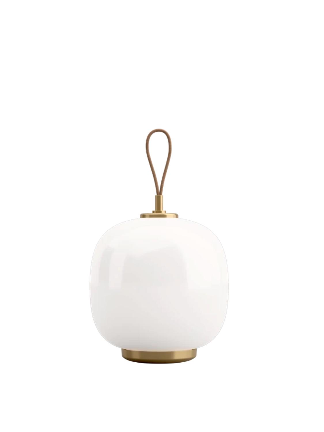 Munnblåst White Opal glass. Bronsert messing med hårlinje og lakkert finish. Mørkebrun reim i ekte skinn. Berøre for å dimme. USB-C til vinklet USB-C 1,5 m.
